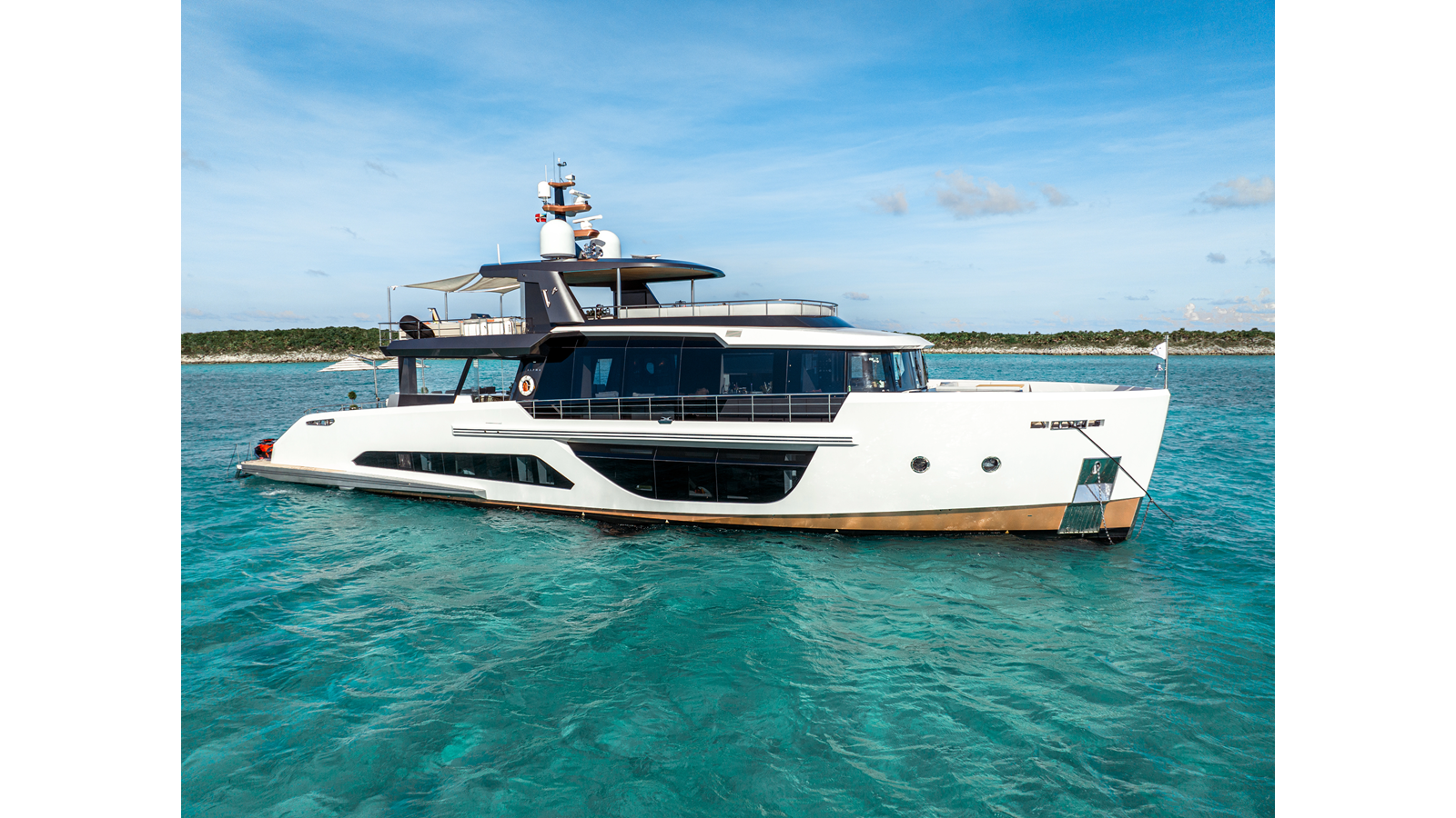 Key features of the aft section of the deck include a hydraulically operated platform capable of supporting a tender, a 2,000-litre plunge pool that can be covered up with teak to serve as a dance floor, an outdoor lounge overlooking the pool and a vast and well protected dining area large enough for 12 guests. Another great lounge with plenty of seating is found on the foredeck while the 76 square metre flybridge deck boasts an incredible impression of space and panoramic views.